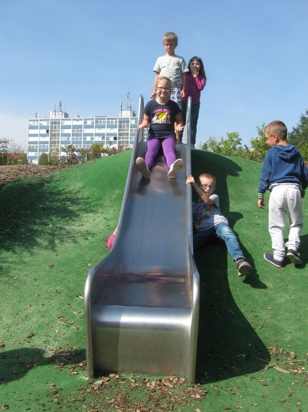Foto (Stadtbildpflege KL): Schüler der Fritz-Walter-Schule testen die neue Rutsche.