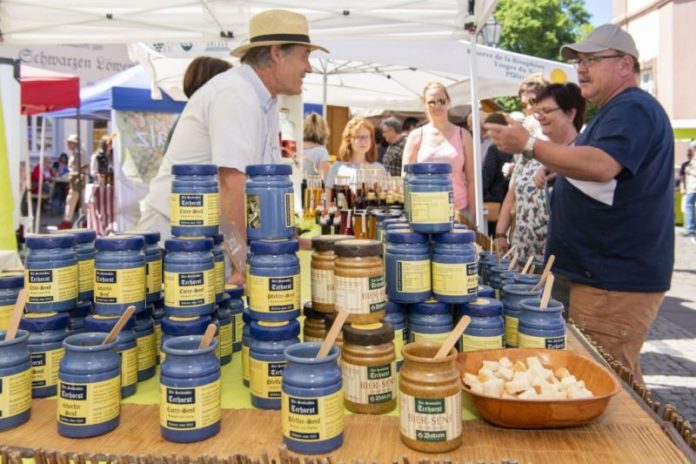 Am Sonntag, 23. September, geht es gesellig, gemütlich und genüsslich zu beim deutsch-französischen Biosphären-Bauernmarkt in Grünstadt. Rund um den Luitpoldplatz bieten etwa 40 Marktbeschicker – darunter Landwirtinnen, Imker, Winzerinnen, Kunsthandwerker, Regionalladen-Besitzerinnen und Wildbret-Vermarkter – aus dem französischen und deutschen Teil des Biosphärenreservats Pfälzerwald-Nordvogesen von 11 bis 18 Uhr ihre umweltschonend produzierten Waren aus der Region an. Dazu gehören Schinken, Wurst, Fleisch von Lamm, Wild und Pferd, Kuh- und Ziegenkäse sowie Essige, Säfte, Biowein, Likör und Sekt genauso wie Obst und Gemüse, Pilze, Marmelade und Honig, Öl, Teigwaren und Kompott. Ein vielfältiges Getränkeangebot von Winzern und Bierbrauern fehlt natürlich auch nicht. Die reiche Produktpalette lädt ein zum Schauen, Schmecken, Kaufen und Plauschen.