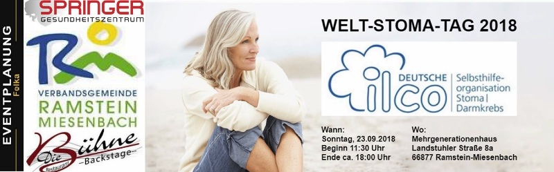 Die Deutsche ILCO Landesverband Rheinland-Pfalz/Saarland e. V. lädt anlässlich des „Welt-Stoma-Tages“ unter seinem Motto „Wir sind da!“, herzlich ein zu einem Fest am Sonntag, 23. September, von 11.30 bis 18 Uhr im Mehrgenerationenhaus (MGH) in Ramstein-Miesenbach, Landstuhler Straße 8a. Schirmherr ist der Bürgermeister von Stadt und Verbandsgemeinde Ramstein-Miesenbach, Ralf Hechler, der die Besucher um 11.30 Uhr im MGH zusammen mit dem Landesvorsitzenden der Deutschen ILCO, Peter Hahn, begrüßen wird.