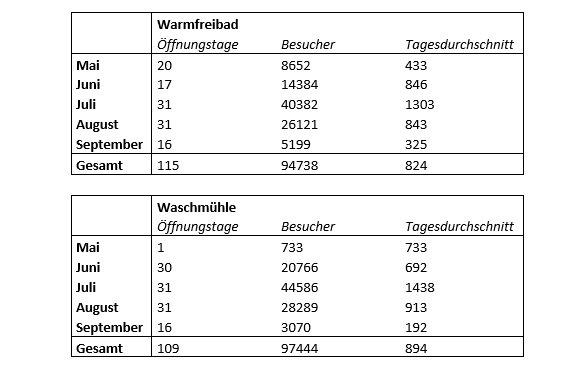 Das Warmfreibad verbuchte seit seiner Öffnung am 12. Mai 94.738 Besucherinnen und Besucher, die Waschmühle, die am 31. Mai öffnete, sogar 97.444 Besucherinnen und Besucher – der beste Besuch der vergangenen zehn Jahre. In beiden Bädern war der besucherstärkste Tag der Donnerstag, 26. Juli, mit 3.117 Gästen im Warmfreibad und 3.401 Gästen in der Waschmühle. Der besucherstärkste Monat war jeweils der Juli mit 40.382 (Warmfreibad) beziehungsweise 44.586 Gästen (Waschmühle). Insgesamt konnte die Stadt über die Eintrittsgelder in diesem Jahr 395.785,90 Euro einnehmen und damit rund 100.000 Euro mehr als im letzten Jahr (296.001,65 Euro). Davon entfielen 205.373 Euro auf das Warmfreibad und 190.412,90 Euro auf die Waschmühle.