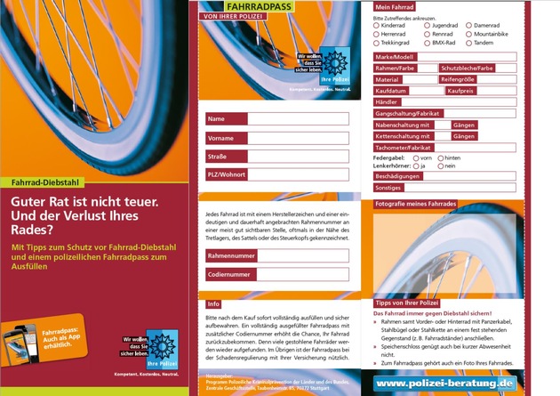 Eine ganze Reihe hilfreicher Tipps und Hinweise, wie man sich vor Fahrraddieben schützen kann, worauf beim Kauf eines Schlosses zu achten ist, und welche Daten seines Fahrrads man sicherheitshalber notieren sollte, finden Sie in dem Faltblatt: „Guter Rat ist nicht teuer“. (https://s.rlp.de/1CF4R) Darin befindet sich auch ein Fahrradpass, in dem die wichtigsten Angaben über das Fahrrad notiert und zusammen mit einem Foto des „Drahtesels“ aufbewahrt werden können. Den Fahrradpass kann man sich auch als kostenlose App sowohl für Android-Smartphones als auch für iPhones herunterladen. Um so schneller hat man seine Fahrrad-Daten zur Hand.