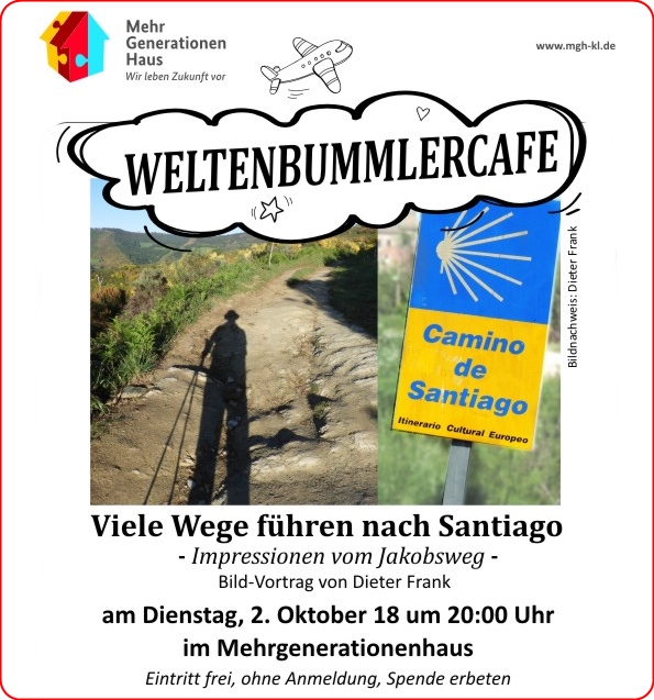 Ganz persönliche Pilger-Eindrücke vom Jakobsweg bietet das MGH-Weltenbummlercafé im Oktober: Unter dem Motto „Viele Wege führen nach Santiago“ vermittelt Referent Dieter Frank am 2.10.18 um 20:00 Uhr in Wort und Bild Impressionen vom Jakobsweg nach Santiago de Compostela.