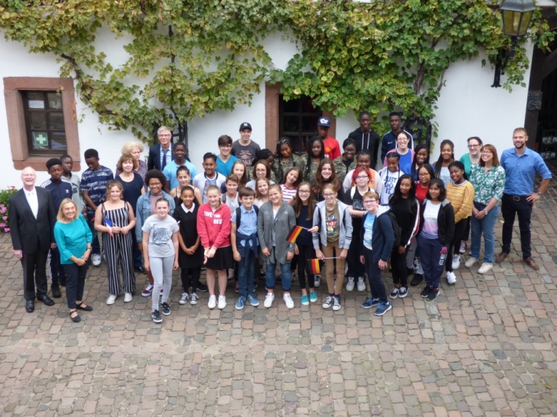 Bild: Beigeordneter Färber mit Schüler/innen und Lehrkräften aus Newham, Reims und Cherbourg.