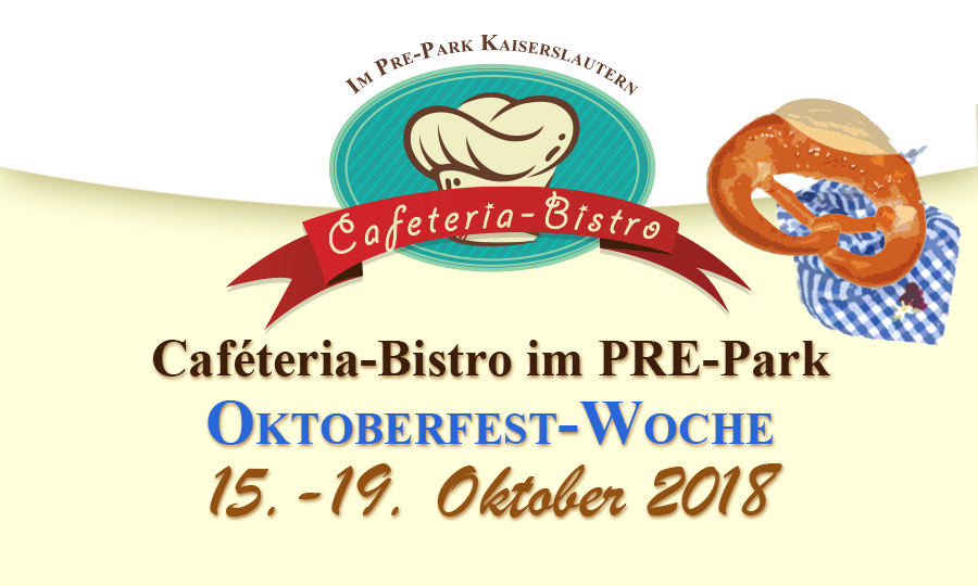 Die Caféteria im PRE-Park hat vom 15.-19. Oktober zum ersten Mal eine Oktoberfest-Woche. Neben den üblichen Mittagsgerichten wie Flammkuchen und Salaten gibt es die ganze Woche über Obazda mit Brezeln. An den einzelnen Tagen wird folgendes serviert: