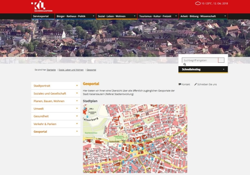 Zur besseren Übersicht über alle öffentlich verfügbaren Geoportale der Stadt Kaiserslautern werden diese nun im Internetauftritt der Stadt auf einer Übersichtsseite dargestellt. Dazu zählen etwa der Flächennutzungsplan, die Baustellenkarte oder die Abrechnungsgebiete der Wiederkehrenden Beiträge. Wer die Karten in eigene Anwendungen einbinden will, findet dort auch die passenden Links zu den jeweiligen WMS-Diensten. Die Übersichtsseite ist über www.kaiserslautern.de/geoportale