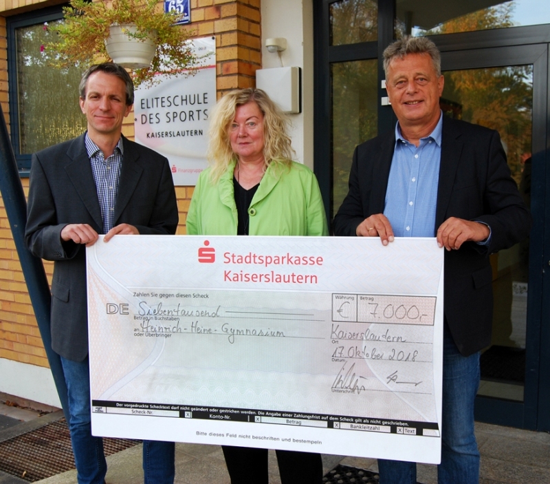Die Sparkassen-Finanzgruppe unterstützt als einziger Förderer aus der deutschen Wirtschaft alle 43 Elitenschulen des Sports in Deutschland. Das Heinrich-Heine-Gymnasium Kaiserslau-tern wird als Eliteschule des Sports in die Fördermaßnahmen einbezogen. Karin Decker, stellvertretendes Vorstandsmitglied der Stadtsparkasse Kaiserslautern überreichte dem Schulleiter Dr. Ulrich Becker und Jan Christmann, Leiter des Sportzweiges, einen Scheck in Höhe von 7.000 Euro.