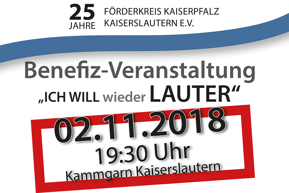 „ICH WILL wieder LAUTER“ – unter diesem Motto hat der Förderkreis 2017 das Projekt Lauter zurück in die Stadtmitte von Kaiserslautern gestartet. Das Ziel: Die Lauter soll wieder sichtbar und erlebbar in unserer Stadtmitte einen Platz finden, angelehnt an den ursprünglichen, historischen Verlauf der Lauter. Und wenn wir alle sagen: „ICH WILL wieder Lauter!“ dann klappt das auch. Der komplette Erlös der Veranstaltung fließt in dieses Projekt.