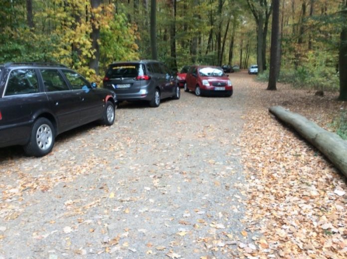 Bild: Nachmittags am Waldeingang, 25.10.2018 Pfaffenberg, der Unitag ist zwar schon fast zu Ende, aber noch stehen zahlreiche Fahrzeuge bis tief in den Wald.