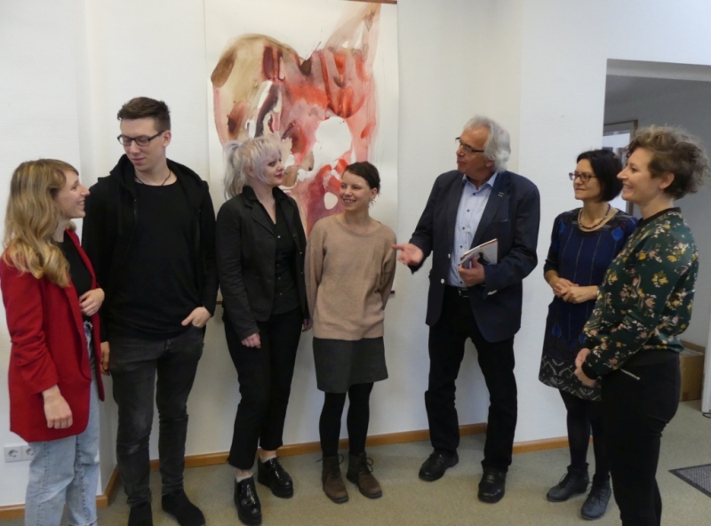 Bu: Vor einem Bild von Clara Clauter (von links): die Künstlerin, Paul Heyduck, Saskia Kaiser und Maria Wedekind sowie Manfred Geis, Claudia Germann und Lena Trost