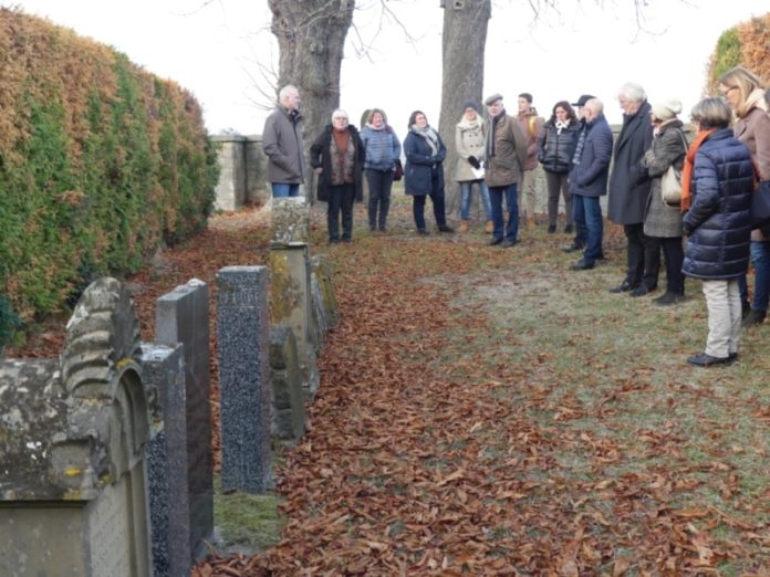 Sodann führten Ortsbürgermeister Rolf Metzger und Forscher Fritz Roth die Gremienmitglieder durch Kirrweiler. „Wir haben sehr viel Wert auf die Aufarbeitung unserer Geschichte, insbesondere der NS-Zeit gelegt“, so Metzger. Der Ort habe eine besondere jüdische Vergangenheit; Friedhof, Mikwe und Synagoge seien erhalten geblieben. In Kirrweiler habe es seit dem 17. Jahrhundert jüdische Mitbürger gegeben, mit denen man ein gutes Miteinander gepflegt hätte. Mitte des 19. Jahrhunderts habe der Anteil der jüdischen Bevölkerung sogar zehn Prozent betragen. Anfang der 1980er Jahre sei man in einem Haus in der Kirchstraße 4 auf die Mikwe aufmerksam geworden und habe sie freigelegt; sie verfüge über eine Treppenanlage und eine Nische für die Kleiderablage sowie zwei Nischen für die Kerzenbeleuchtung. In der Schlossstraße wurde 1766 eine Synagoge errichtet, deren Außenmauer dringend saniert werden müsste. Der jüdische Friedhof sei nur noch ein Gedenkort, denn die Steine seien in der NS-Zeit abgebaut und später – für Juden untypisch – in einer Reihe angeordnet worden.