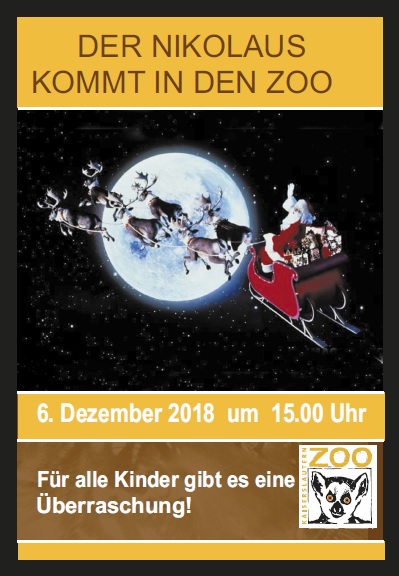 Er wird um 15.00 Uhr die Kinder durch den Zoo führen. Haltestationen sind nicht nur die einzelnen Gehege mit den Tieren, sondern auch unsere „lebende Weihnachtskrippe!“. Der Nikolaus hat natürlich auch eine Überraschung für jedes Kind dabei. Das Zoo-Team sorgt mit Punsch für das leibliche Wohl der Besucher.