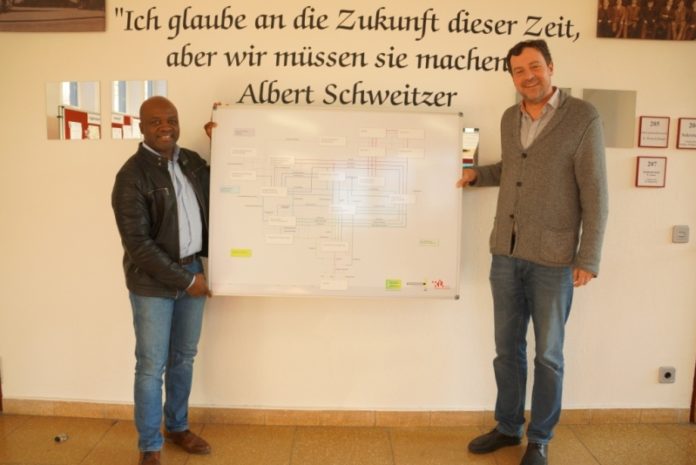 Auf dem Foto: VHS Bildungsberater Piyabalo Tcha-Tokey übergibt dem für die Berufsberatung zuständigen Studiendirektor Georg Ehrmann vom ASG die Magnettafel.