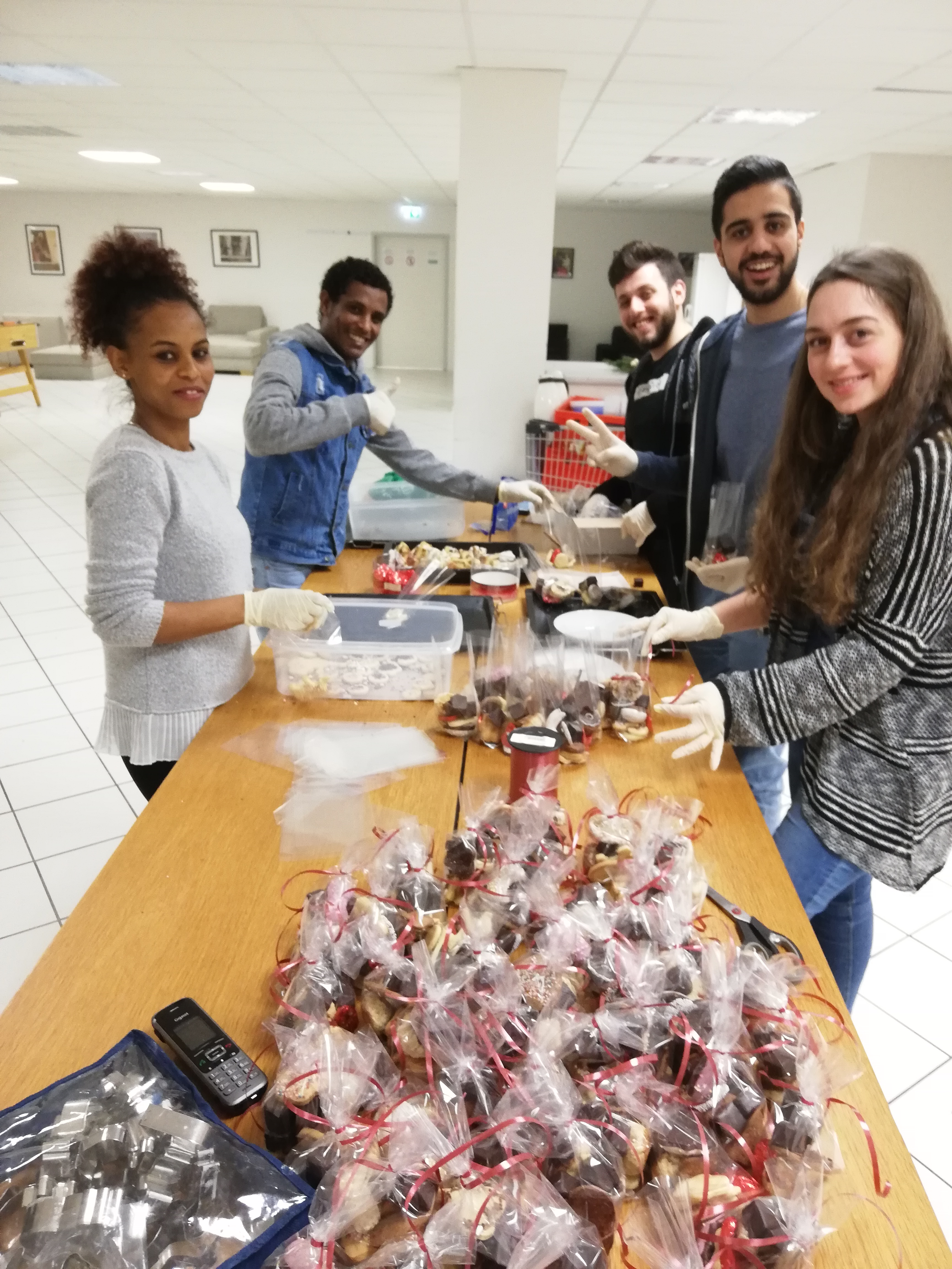 Wenn es etwas gibt, was Menschen in aller Welt verbindet und zusammen an einen Tisch bringt, dann ist es Essen und Trinken. Aus diesem Grund hat das Projektbüro für Integration und Interkulturelle Angelegenheiten im Rahmen des vom Bund geförderten Projektes „Integration findet Stadt – Im Dialog zum Erfolg“ das „Projekt Kochkultur“ ins Leben gerufen. Dabei sollen in losen Abständen immer wieder Kochevents durchgeführt werden, bei denen Menschen unterschiedlicher Herkunft miteinander kochen und natürlich auch essen können. Zum Auftakt gab es nun eine Backaktion zu Gunsten der Kaiserslauterer Tafel. An zwei Terminen haben Geflüchtete im „P90“ in der Pariser Straße sowie im Haus der Begegnung (Villa Jaenisch) in den vergangenen Tagen Weihnachtsplätzchen gebacken. 90 Tütchen kamen so zustande, die am Dienstagmorgen an die Lautrer Tafel übergeben wurden, wo sie nun an Bedürftige weitergegeben werden.