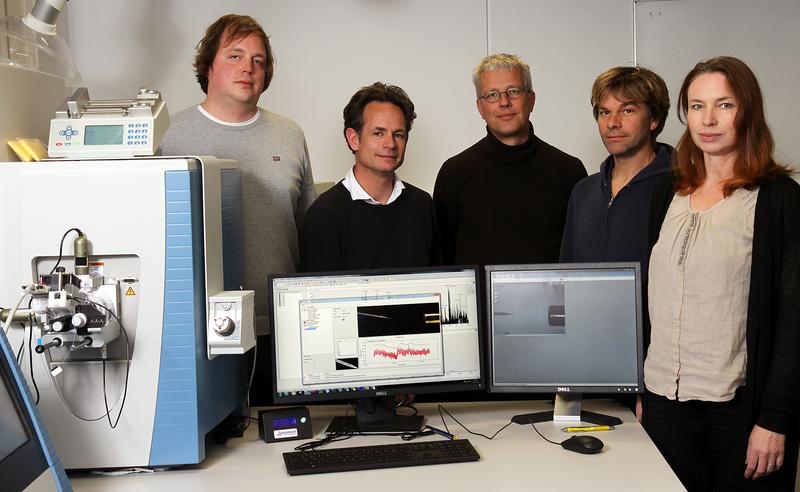 Bu: Sie arbeiten mit dem neuen Großgerät (von links nach rechts): Jun.-Prof. Dr. Timo Mühlhaus, Dr. Markus Räschle, Prof. Dr. Michael Schroda, Dr. Frederik Sommer und Prof. Dr. Zuzana Storchová