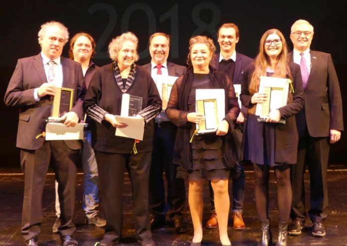 Bezirkstagsvorsitzender Theo Wieder (rechts) mit den Pfalzpreisträgern des Jahres 2018: ausgeschrieben waren der Pfalzpreis für Musik, der Pfalzpreis für Bildende Kunst in der Sparte Malerei und der Medienpreis Pfalz