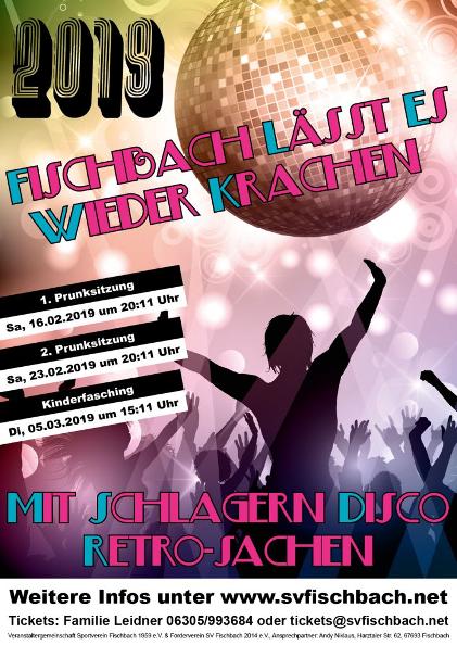 Unter dem Motto „Fischbach lässt es wieder krachen, mit Schlagern, Disco, Retro-Sachen“ haben unserer Aktiven wieder ein tolles und abwechslungsreiches Programm auf die Bühne gezaubert. Für die musikalische Begleitung an den Prunksitzungen sorgt wieder die Band „2 Nachtschwärmer“.