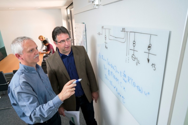 Anregende Diskussion: Jan Mohring (links) und Andreas Wirsen gehören beim Fraunhofer ITWM zum Team von MathEnergy. Ziel des Projekts ist die Erstellung einer Softwarebibliothek, die das Gas- und Stromnetz Deutschlands komplett abbildet.