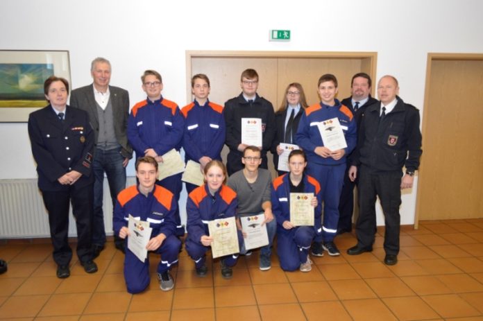 Zehn Jugendliche haben unter der Leitung ihrer Stadtjugendfeuerwehrwartin Barbara Reidenbach im letzten Jahr die Ausbildung der Leistungsstufen I bis III für das Abzeichen der Jugendflamme erfolgreich absolviert. Neun Mitglieder wurden mit der höchsten Auszeichnung der Jugendfeuerwehr, der Leistungsspange der Deutschen Jugendfeuerwehr, ausgezeichnet.