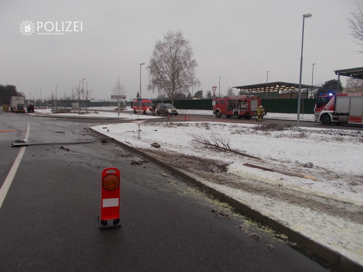 Zu einem Unfall ist es am Donnerstag im Bereich des Opelkreisels gekommen, weil sich der Fahrer eines Lastwagens an einem Bonbon verschluckte. 300 Liter Dieselkraftstoff liefen aus, weil sich der Mast eines Straßenschilds in den Lkw-Tank bohrte.