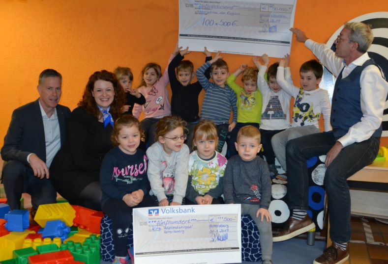 Bereits zum dritten Mal schüttet die Volksbank Kaiserslautern im Rahmen ihrer Spendenaktion „100 x 500 Euro“ insgesamt 50.000 Euro an Kindergärten in ihrem Geschäftsgebiet aus.