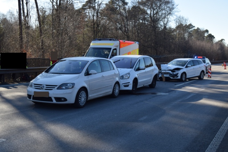 Am Freitagmittag mussten Beamte der Autobahnpolizei auf der A6 bei Kaiserlautern einen Verkehrsunfall mit mehreren leichtverletzten Personen aufnehmen, der einen Stau von mehreren Kilometern zur Folge hatte. Ein 26-jähriger Autofahrer sah ein Stauende zu spät und krachte in den Ford einer 55-jährigen Frau. Durch die Wucht des Aufpralls wurde der PKW der Frau auf den vor ihr stehenden Golf geschoben. Alle drei Fahrzeuge mussten abgeschleppt werden. Die Autobahn war bis zur abschließenden Unfallaufnahme und der Reinigung der Fahrbahn teilweise gesperrt. Die Insassen des Fords und des VWs wurden vorsorglich in die umliegenden Krankenhäuser verbracht. An allen Fahrzeugen entstand erheblicher Sachschaden. Der Gesamtschaden wird auf ca. 50000 Euro geschätzt.