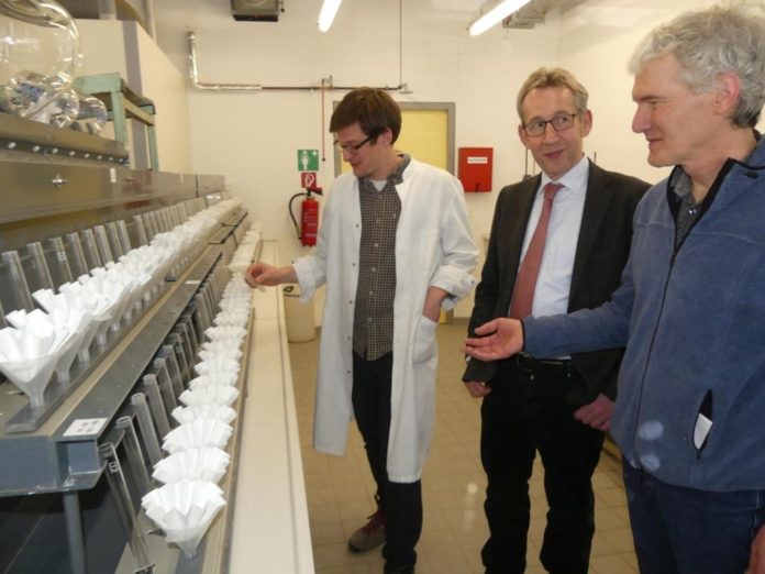 Bu: Gewinnung von Extraktionslösungen zur Bestimmung der Nährstoffverfügbarkeit in Reststoffen: Projektleiter Prof. Dr. Franz Wiesler (Mitte) mit Dr. Martin Armbruster (rechts) und Max Prigge, die das Vorhaben betreuen