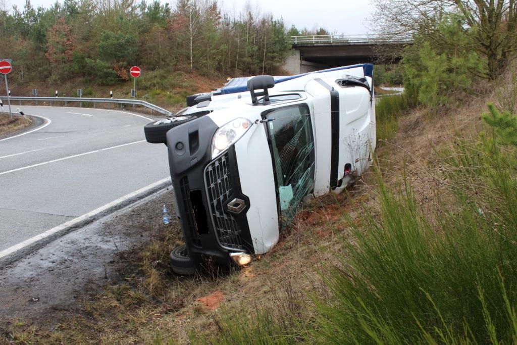 Am 09.03.2019, 12:45 Uhr befuhr ein 21-jähriger mit einem Kleintransporter zunächst die A 63 Richtung Mainz. An der Anschlussstelle Sembach fuhr er von der BAB ab. Am Ende der Ausfahrt kippte der Transporter in der Rechtskurve infolge nicht angepasster Geschwindigkeit und mangelhafter Ladungssicherung (Pkw-Katalysatoren) nach links um. Anschließend rutschte das Fahrzeug über die Fahrbahn und prallte auf der gegenüberliegenden Seite gegen die Böschung. Fahrer und Beifahrer blieben unverletzt. Es entstand ein Gesamtschaden von ca. 15 000,- EUR.