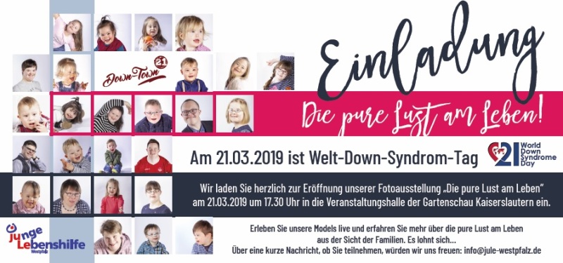 Um auch in Kaiserslautern auf diesen Tag aufmerksam zu machen und zu zeigen, dass Menschen mit Down-Syndrom in die Mitte unsere Gesellschaft gehören, haben die Gruppe Down-Town 21 und die Junge Lebenshilfe Westpfalz die Fotoausstellung „Die pure Lust am Leben“ organisiert.
