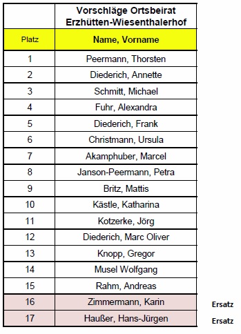 Auf der Mitgliederversammlung des SPD Ortsvereins Erzhütten-Wiesenthalerhof für die Kommunalwahl wurde die Ortsbeiratsliste als auch der Ortsvorsteherkandidat Thorsten Peermann einstimmig von der Mitgliederversammlung gewählt.