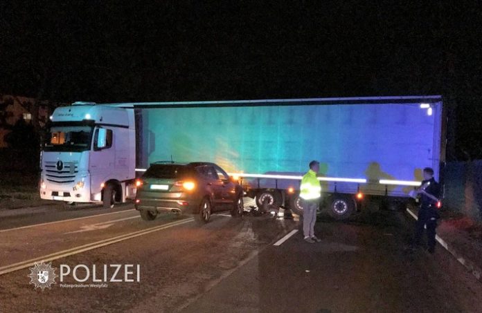 Ein Lkw und ein Pkw sind sich am späten Montagabend auf der B270 sozusagen in die Quere gekommen. Nach den derzeitigen Erkenntnissen hatte sich der Lkw-Fahrer, der von der A6 kam und in Richtung KL-Hohenecken fuhr, auf der Suche nach einem Schlafplatz verfahren. Deshalb wollte der 51-jährige Mann gegen 22.20 Uhr kurz nach der Ampelanlage im Bereich Vogelweh seinen Sattelzug auf der Straße wenden. Allerdings erkannte der 52 Jahre alte Fahrer des nachfolgenden Pkw die Situation zu spät und krachte gegen den Auflieger des gerade quer stehenden Sattelzugs.
