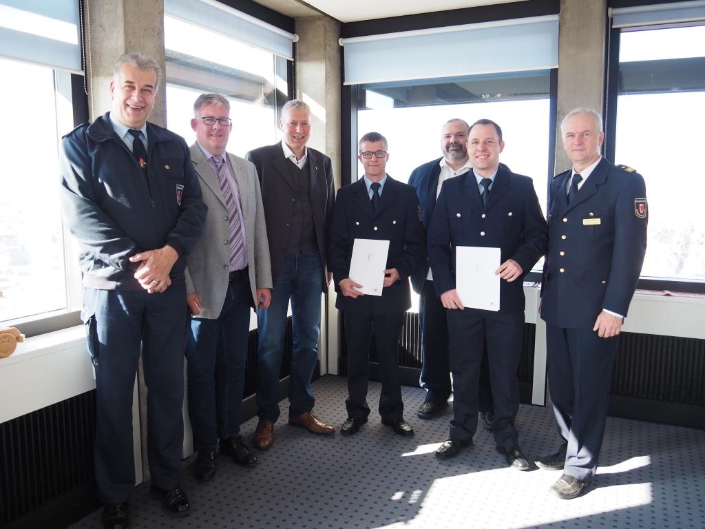 Ein besonderer Tag war das für Jonas Schmalenberger und Nils Burgmann, die sich in den Räumlichkeiten des Beigeordneten Peter Kiefer eingefunden hatten. Im Beisein des Leiters des Referats Feuerwehr und Katastrophenschutz, Konrad Schmitt, und seines für den Bereich Verwaltung und Katastrophenschutz zuständigen Mitarbeiters Jürgen Stegner, Christian Staab vom Referat Personal, sowie des Personalratsmitglieds Michael Andes ernannte der Feuerwehrdezernent die beiden Feuerwehrleute zu Beamte auf Lebenszeit. „Sie haben ab sofort ein Dienst- und Treueverhältnis gegenüber der Stadt und nehmen hoheitliche Aufgaben der Gefahrenabwehr wahr“, so Kiefer bei der Überreichung der Urkunden.