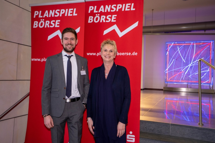 Das Foto zeigt den siegreichen Teilnehmer Philipp Lupp, Hochschule Kaiserslautern und Planspiel-Börse-Spielleiterin Claudia Weber von der Kreissparkasse Kaiserslautern.