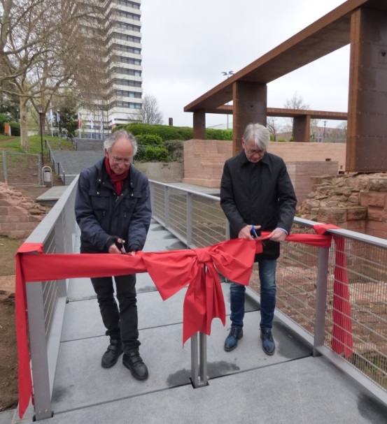 Die Erschließung des historischen Burgbergs am Fuß des Rathauses hat am Montagnachmittag einen wichtigen Meilenstein genommen. In Anwesenheit von Vertretern aus Verwaltung, Politik, des Fördervereins Kaiserpfalz sowie der beteiligten Planungsbüros und Baufirmen wurde die Fußgängerpassage zwischen Burgstraße und Rathausvorplatz offiziell freigegeben und eröffnet. Das feierliche Durchschneiden des Bandes übernahmen Oberbürgermeister Klaus Weichel als Bauherr und Rüdiger Schulz von der Generaldirektion Kulturelles Erbe des Landes Rheinland-Pfalz, die die Wiederbelebung der Anlage seit vielen Jahren begleitet.