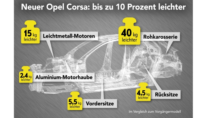 Der Opel Corsa der nächsten Generation basiert auf einer komplett neuen Leichtbaukonstruktion – Ausgangspunkt für eine deutliche Effizienzsteigerung. Noch in diesem Jahr wird der Corsa Premiere feiern. Egal ob mit Benzin- und Dieselmotoren oder erstmals in einer rein elektrischen Version – jeder neue Corsa profitiert von seinem geringen Gewicht: Die Fahrdynamik steigt, der Verbrauch sinkt. Die leichteste Variante der kommenden Generation unterbietet sogar die magische Tausend-Kilo-Marke: Der Fünftürer wird ohne Fahrer lediglich 980 Kilogramm wiegen. Dieses Modell ist verglichen mit seinem Vorgänger um stolze 108 Kilogramm leichter, eine Einsparung von rund zehn Prozent – und das bei vergleichbaren Längenmaßen von 4,06 Meter. Solch eine Gewichtsreduzierung bei ähnlichen Abmessungen ist gerade bei einem Kleinwagen ein außerordentlicher Entwicklungserfolg, von dem die Kunden unmittelbar profitieren werden.