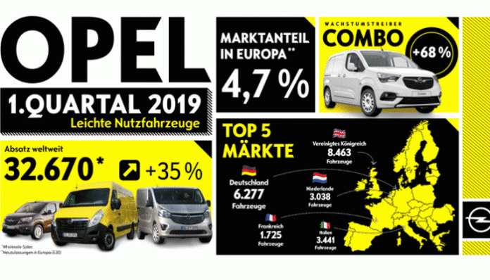 Die Offensive von Opel im Geschäft mit leichten Nutzfahrzeugen greift: Im ersten Quartal 2019 verkaufte der Rüsselsheimer Autobauer weltweit fast 33.000 leichte Nutzfahrzeuge (LCV) und damit 35 Prozent mehr als im Vorjahreszeitraum. Der Marktanteil bei Neuzulassungen in Europa (E30) kletterte damit um 0,6 Prozentpunkte auf 4,7 Prozent. Im Unternehmensplan PACE! hat Opel das Ziel festgelegt, seinen LCV-Absatz bis 2020 um 25 Prozent zu steigern.