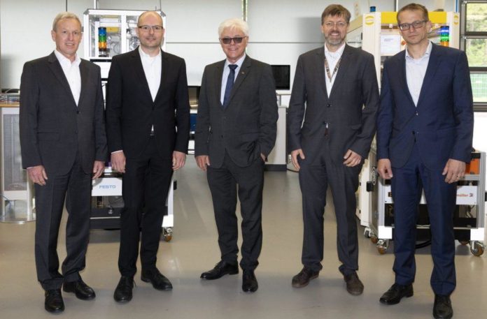 BU: Der Vorstand der Technologie-Initiative SmartFactory KL e.V. (v.l.n.r.): Klaus Stark, Prof. Dr. Martin Ruskowski (Vorsitzender), Prof. Dr. Detlef Zühlke (Ehrenmitglied), Andreas Huhmann, Dr. Thomas Bürger. Foto: SmartFactory-KL/M. Schäfer