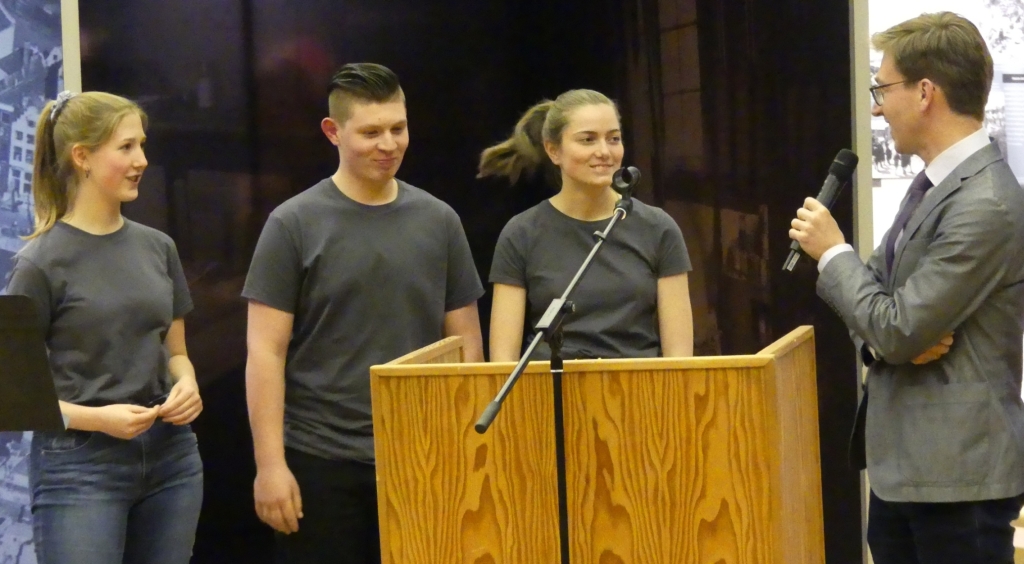 Friedrich Burkhardt, Direktor des Theodor-Heuss-Gymnasiums, drückte seine große Freude über die gemeinsame Aktion der beiden Schulen aus. Sie sei „eine Chance für den Geschichts-, aber auch den Deutsch- und Sozialkundeunterricht“. Die Auseinandersetzung mit dem Einzelschicksal gebe besondere Ansatzpunkte, etwa für die Frage, wie man sich selbst verhalten würde. Das Projekt rege dazu an, auch die regionale Geschichte zu erforschen. Die Anne-Frank-Realschule plus sei hellauf begeistert gewesen, als der Bezirksverband Pfalz mit der Ausstellung auf sie zukam, sagte Schulleiter Johannes Thomas. Zunächst gewöhnungsbedürftig, aber dann hervorragend sei das Konzept, dass Jugendliche Gleichaltrige führen würden. Die Peer Guides hätten sich in einer zweitägigen Ausbildung auf ihre Aufgabe vorbereitet und würden „ihr Wissen mit großer Begeisterung“ vermitteln. Er hob hervor, dass darüber hinaus die Medien-AG der Schule Texte eingesprochen habe; die Audio-Guides könne man über QR-Codes in der Ausstellung in Deutsch, Italienisch, Türkisch und Arabisch über das Smartphone abrufen. Für die musikalische Gestaltung der Eröffnung sorgte der Leistungskurs Musik der elften Klasse des Theodor-Heuss-Gymnasiums unter Leitung von Friedrich Burkhardt.