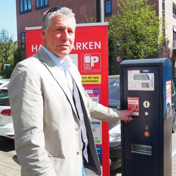 BU: Beigeordneter Peter Kiefer beim offiziellen Start zum Handyparken im April 2018