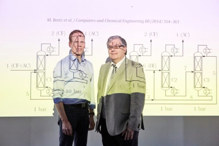 Sei es in der Landwirtschaft, in der Industrie oder auch im Privathaushalt: Chemikalien werden überall benötigt. Allerdings verbraucht ihre Produktion extrem viel Energie. Mit einem neuartigen hybriden Zugang lässt sich je nach Anlage und Prozess Energie im zweistelligen Prozentbereich einsparen. Die Entwicklung fand im Team von Priv.-Doz. Dr. Michael Bortz und Prof. Karl-Heinz Küfer am Fraunhofer-Institut für Techno- und Wirtschaftsmathematik ITWM statt, die dafür mit dem Joseph-von-Fraunhofer-Preis ausgezeichnet werden.