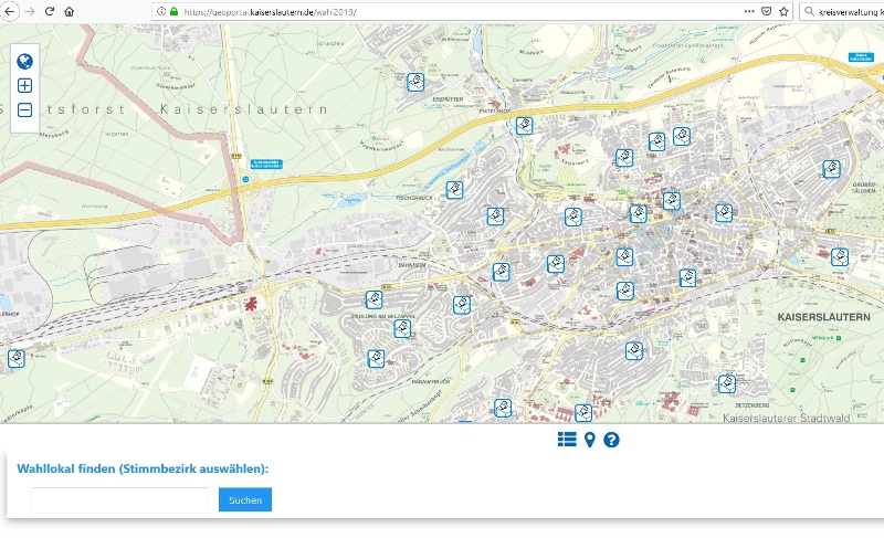 Pünktlich für die Wahlwoche hat die Abteilung „Graphische Datenverarbeitung“ des Referats Stadtentwicklung das GeoPortal „Wahl 2019“ fertiggestellt. Wer nicht sicher ist, wo sich sein Wahllokal befindet, kann dort seinen Stimmbezirk in eine Suchmaske eingeben und bekommt das Lokal dann auf dem Stadtplan angezeigt. Das Geoportal ist auf der Homepage der Stadt Kaiserslautern zu finden unter https://geoportal.kaiserslautern.de/wahl2019. Eine Übersicht über alle Geoportale finden alle Interessierte unter www.kaiserslautern.de/geoportale.
