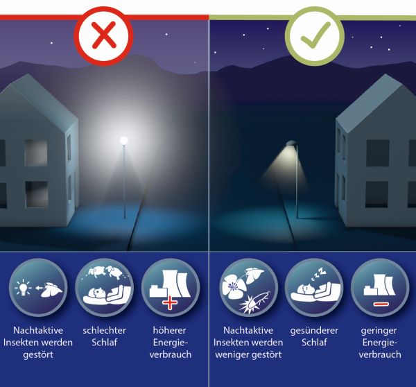 · Warmweiße Leuchtmittel sollen eingesetzt werden. Diese enthalten weniger Blauanteile und werden damit weniger in der Atmosphäre gestreut, zudem ziehen sie weniger Insekten an und hemmen die Produktion des Dunkelhormons Melatonin. Hier gilt maximal 3000 Kelvin Leuchten verwenden.