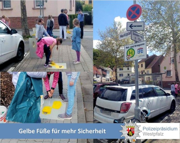 „Gelbe Füße“ zieren seit heute Nachmittag die Gehwege rund um die Grundschule im Stadtteil Erfenbach. Sie sind aber nicht als Dekoration gedacht, sondern markieren für die rund 180 Schülerinnen und Schüler der Klassenstufen 1 bis 4 den sichersten Weg zu ihrer Schule.