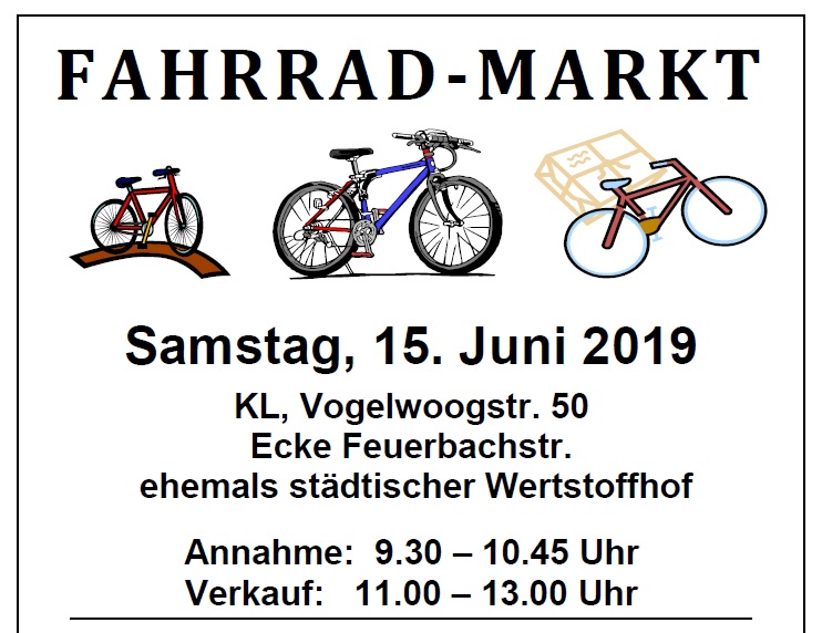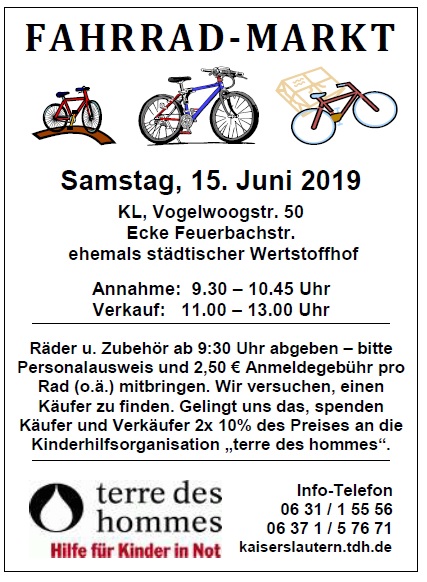Der nächste Fahrradmarkt von terre des hommes in Zusammenarbeit mit dem städtischen Vélo-Projekt und dem Fahrradclub ADFC Kaiserslautern ist am Samstag, dem 15. Juni, von 9:30 bis 13:00 Uhr in der Vogelwoogstr. 50 (ehemals Wertstoffhof).