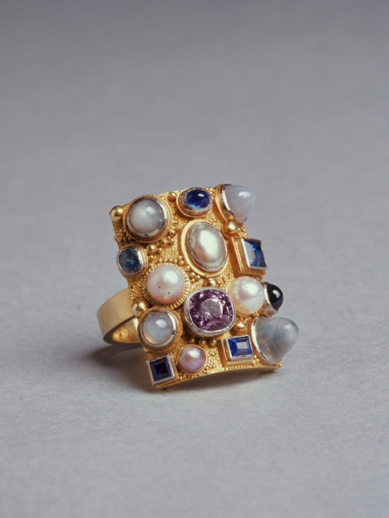 Aus Gold, Platin, Saphir, Mondstein, Sternsaphir, Perle, granuliert: Ring mit Edelsteinen und Perlen von Elisabeth Treskow aus dem Jahr 1929, Museum für Angewandte Kunst Köln, Inventarnummer G1085