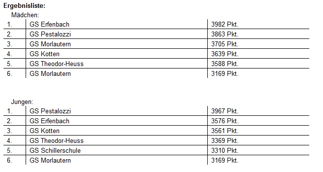 Auf dem Sportgelände im Schulzentrum Süd trafen sich am 17. Juni 2019 ca. 120 Schülerinnen und Schüler aus sechs Kaiserslauterer Grundschulen um die diesjährigen Stadtmeister in der Leichtathletik zu ermitteln. Bei hochsommerlichen Temperaturen traten die Schülerinnen und Schüler in den Disziplinen 50m-Lauf, Weitsprung, Schlagballweitwurf und 800m-Lauf zum Wettkampf an. In jeder Disziplin starteten jeweils vier Jungs und vier Mädels der beteiligten Schulen, bei den Jungen siegte die Grundschule Pestalozzi, bei den Mädchen die Grundschule Erfenbach.