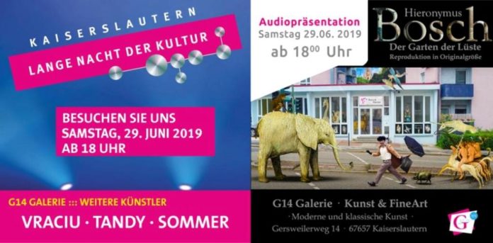 Im Rahmen der „Langen Nacht der Kultur“ in Kaiserslautern ist am 29.06. im Gersweilerweg 14 Kaiserslautern die Reproduktion eines der Highlights der Kunstgeschichte, Hieronymus Boschs Meisterwerk „Der Garten der Lüste“, in 1:1 Originalgröße von 18 bis 24 Uhr zu sehen.