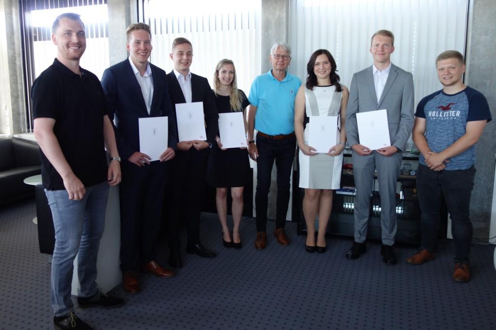 Unterstützt werden die angehenden Beamtinnen und Beamten in ihrer Ausbildung von Delia Benz, Jacqueline Münch und Jonas Jung (3. Ausbildungsjahr), die den Fünfen als Mentorinnen und Mentor zur Seite stehen. Das Foto zeigt die Gruppe mit OB Weichel in seinem Dienstzimmer.