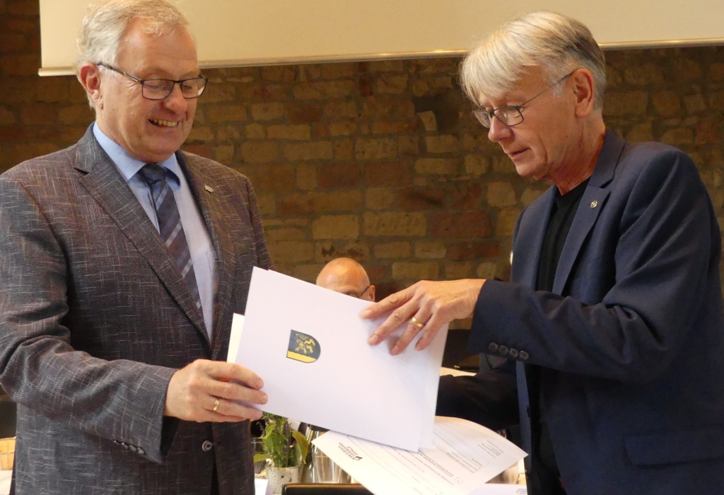 Bu: Zum vierten Mal zum Bezirkstagsvorsitzenden gewählt: Theo Wieder (links) erhält von Bezirkstagsvize Dr. Klaus Weichel die Ernennungsurkunde