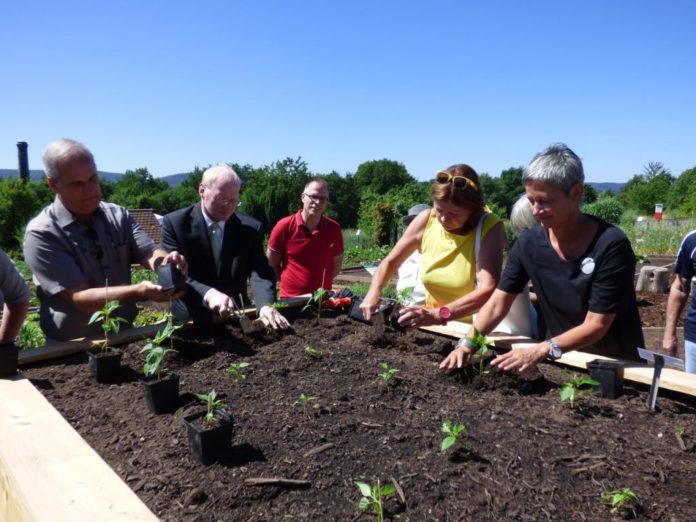 Insgesamt 37 Sorten finden sich im Garten vom Lauchgemüse über Kürbisgewächse und diverse alte Getreidesorten bis hin zu einem Chiligewächs mit dem schönen Namen „Rotes Teufele“. Färber bedankte sich bei Diplom-Biologin im Annika Lange, die den Garten ideenreich geplant, gestaltet und die informative Beschilderung ausgearbeitet hat, und an Wolfgang Hain und sein Team. „Sie haben hier über Wochen ein sehr vorzeigbares und sehenswertes Ergebnis geschaffen“, freute sich Färber. Besonders hob er hervor, dass das Jobcenter Stadt Kaiserslautern diese Maßnahme unterstützt und genehmigt habe. Weiterhin dankte er dem Deutsch Amerikanischen Frauenclub, die mit einer sehr großzügigen Spende die Beschilderung in dem Garten ermöglichten, sowie Claudia Lenhardt, die das Thema mit ihrem Glockestubb-Team kulinarisch umgesetzt hat. Abschließend bedankte sich Färber bei der Leiterin des Ökologieprogramms, Doris Preuninger, für ihre Ideen zur Gestaltung des Kaiserbergs und ihr langjähriges Engagement für das Ökologieprogramm.