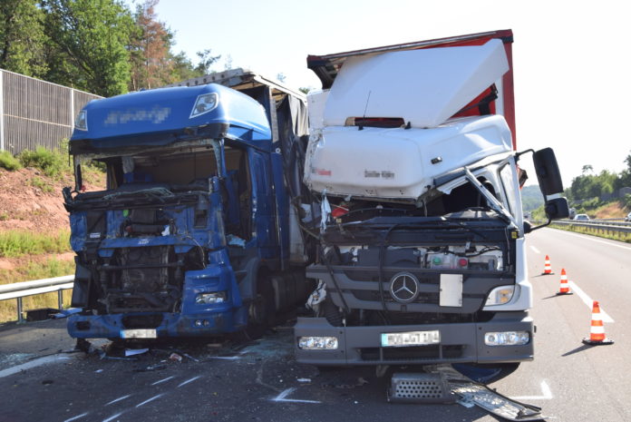 Ein Lkw-Fahrer war zwischen Kaiserslautern-Centrum und Kaiserslautern-West in das Stauende gebrettert und mit einem vorausfahrenden Kipplaster kollidiert. Der 50-jährige Unfallverursacher wurde dabei in seinem Lkw eingeklemmt. Ein nachfolgender Sattelzug fuhr in die Unfallstelle. Er prallte mit dem Sattelzug des 50-Jährigen zusammen und schrammte an dem Lastwagen vorbei, bis sein Fahrzeug neben dem zuvor verunfallten Lkw zum Stehen kam. Beide Fahrer wurden schwer verletzt. Sie kamen ins Krankenhaus.